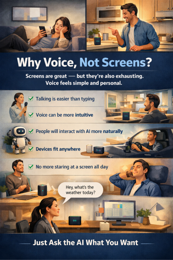 Screens are great — but they’re also exhausting. People scroll endlessly, get distracted, and can’t focus. Voice, on the other hand, feels simple and personal.